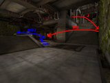 situácii, ktorá sa dá vyriešiť double jumpom (červený skok), ale WDJ (modrý